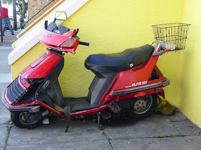 A bright yellow taxi next to bright yellow pavement segments. A red vespa, a shiny silver vespa.